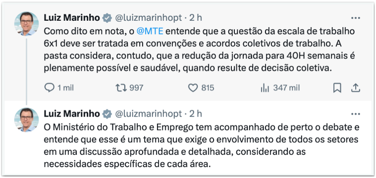 As postagens de rede social do ministro, de novembro de 2024, contra a PEC pelo fim da jornada 6×1.